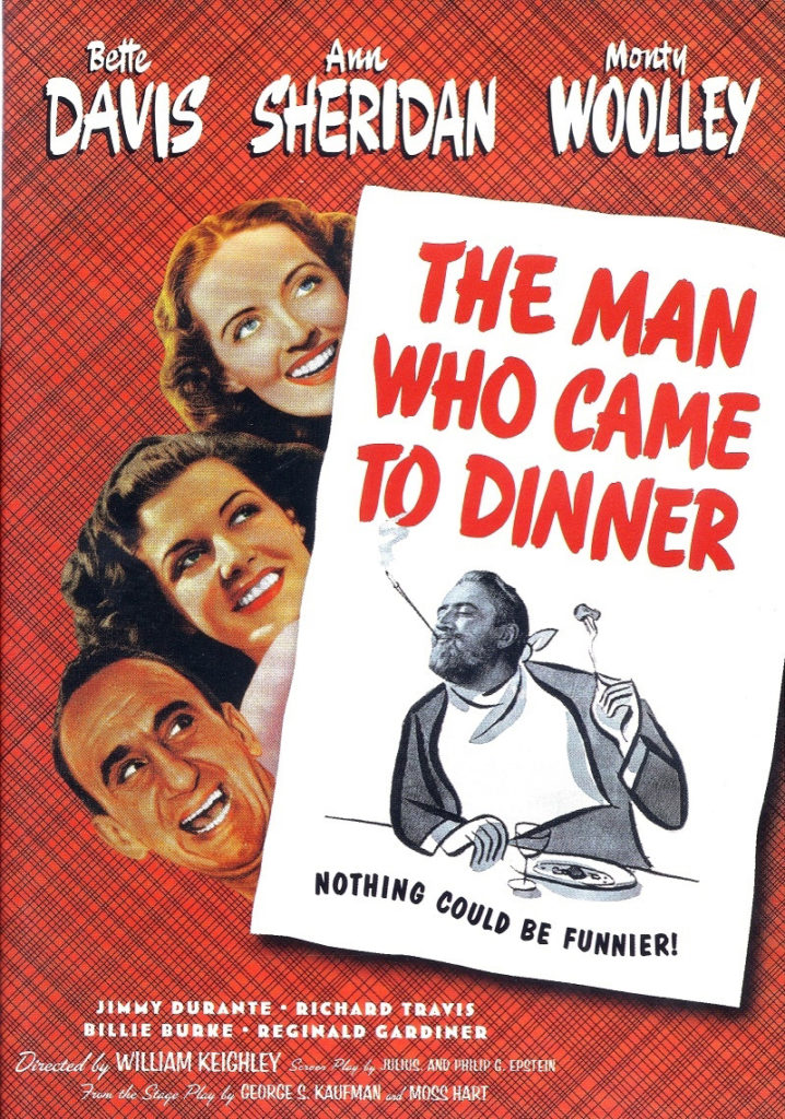 “The Man”, wheelchair-bound Sheridan Whiteside, has the funniest lines, and no wonder, since he’s based on acerbic larger-than-life personality and critic Alexander Woollcott. (It was Woollcott who uttered the famous phrase, “All the things I really like to do are either immoral, illegal or fattening.”) Moss Hart and George S. Kaufman, famous authors of the play from which this film was adapted, were good friends with Woollcott, and he’d asked that they write a play FOR him. They never came up with a suitable plot, but one day Woollcott visited Hart unexpectedly and at once took over the master bedroom, started ordering Hart’s staff around, and turned the whole place upside down with his demands and cutting remarks. When Hart described the visit to George S., they postulated, “Imagine what would have happened if he’d broken his leg and had to stay?” They looked at each other and knew immediately that they had a play.