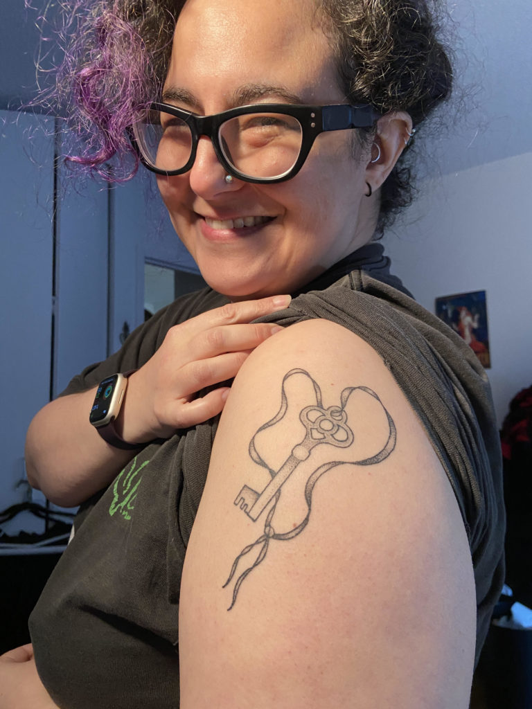 Jenni M., a freelance writer in Brooklyn, told me a tattoo was the final taboo in her liberal and not-very-religious Jewish household. She wore black and dyed her hair purple and got pierced, but tattoos were off limits. Her mom would say, “I’m gonna haunt you if you get tattooed after I die. I know you’re gonna do it and I’m gonna haunt you.” Jenni did wait until a few years after her mom passed to get her first tattoo — a skeleton key Jenni had worn as a necklace and had found in her mom’s drawer when she was young. It probably belonged to her grandmother. I love that the key tattoo, in a small way, honored those who would be rolling in their graves at its existence.